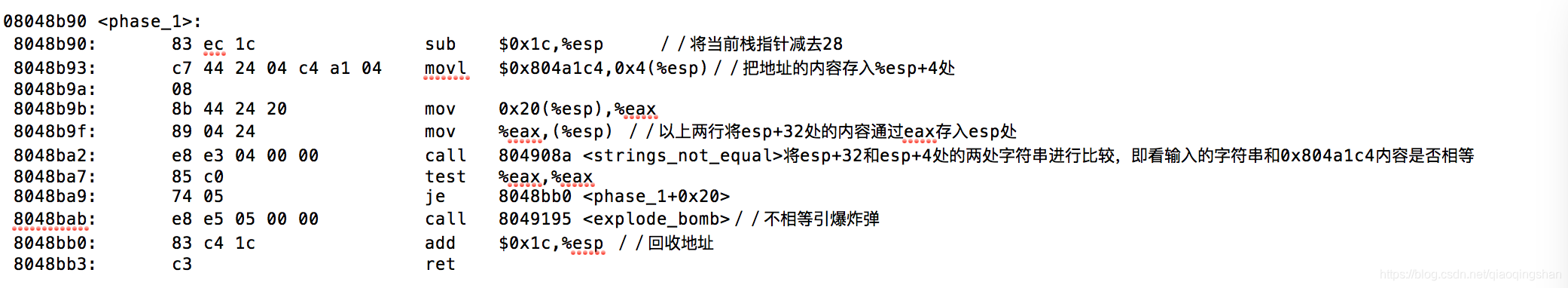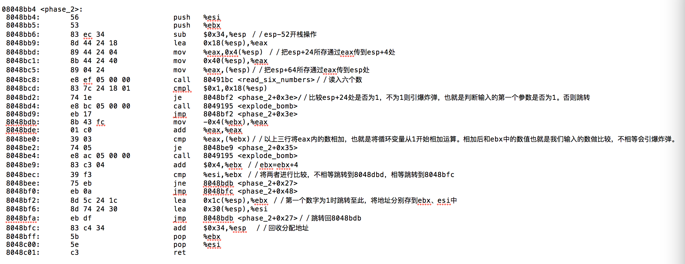 第二阶段要求输入六个数字,并且输入的第一个数字必须为1。整个程序经历五次循环,将循环变量从1开始相加,或者说做乘2运算(eax+eax),每次循环都要和相应次序输入的数字进行比较,必须保证都相等才能避免爆炸。