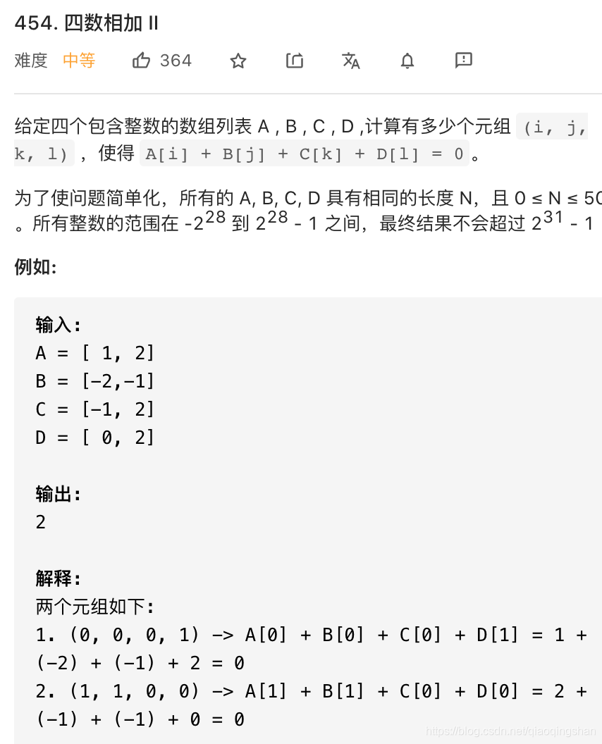 然后判断这个map里是不是有key等于(0-c[i]-d[j])的,也就是等于cd数组任意两数之和的倒数。并设立一个计数器count,如果有,就加上这个key对应的value。