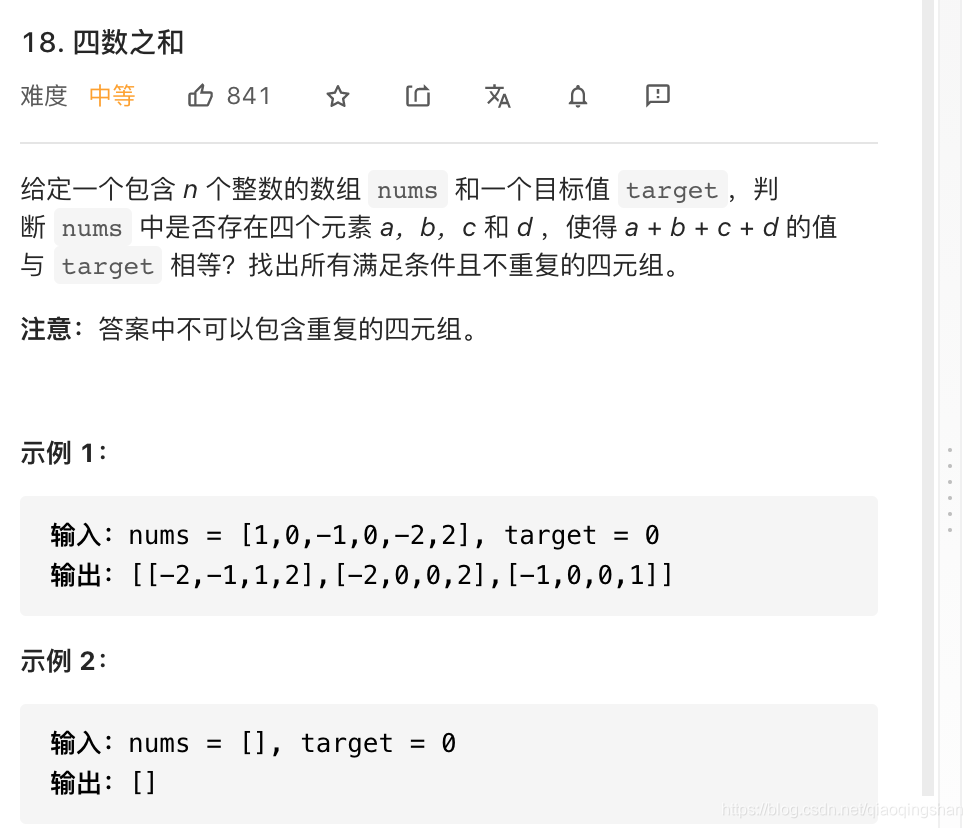 本题主要思路就是在三数之和的基础上再套一个循环就可以了,设置四个指针,指向四个数字,然后再注意一下去重方面。