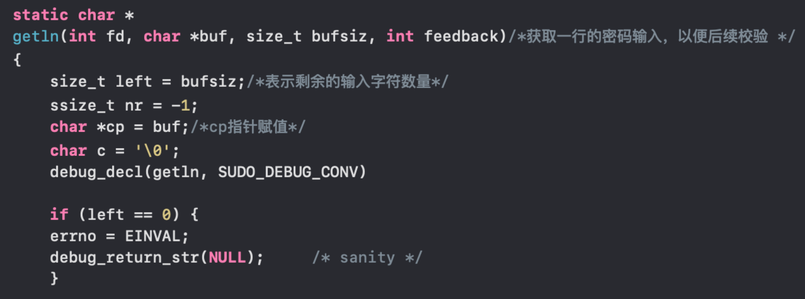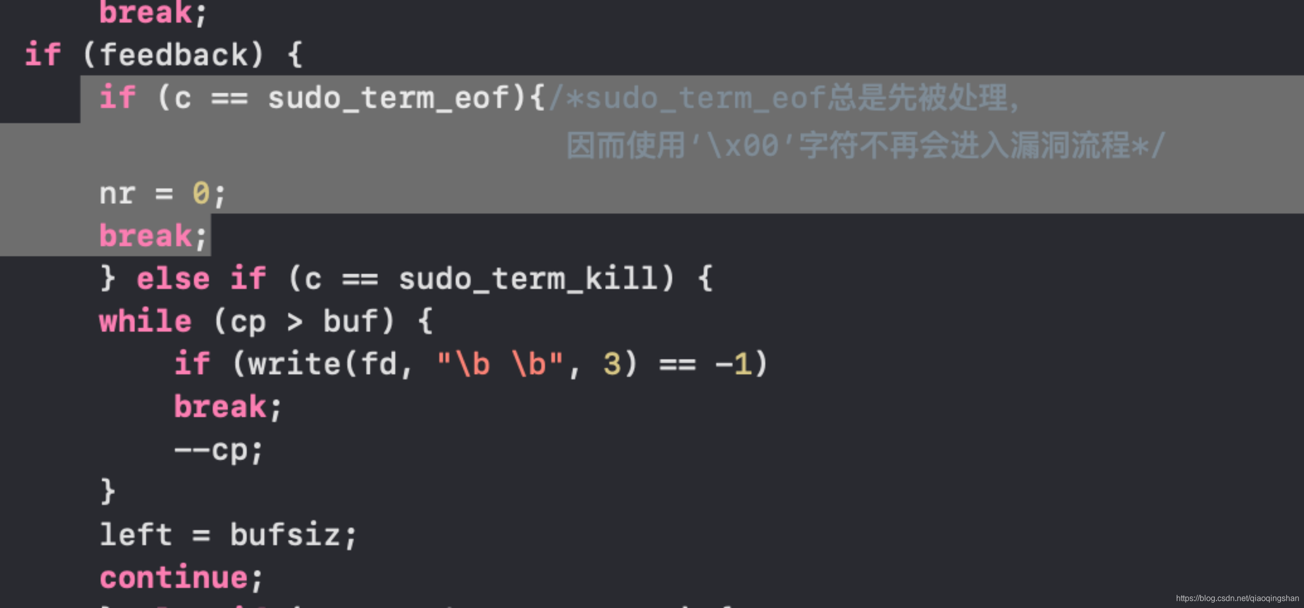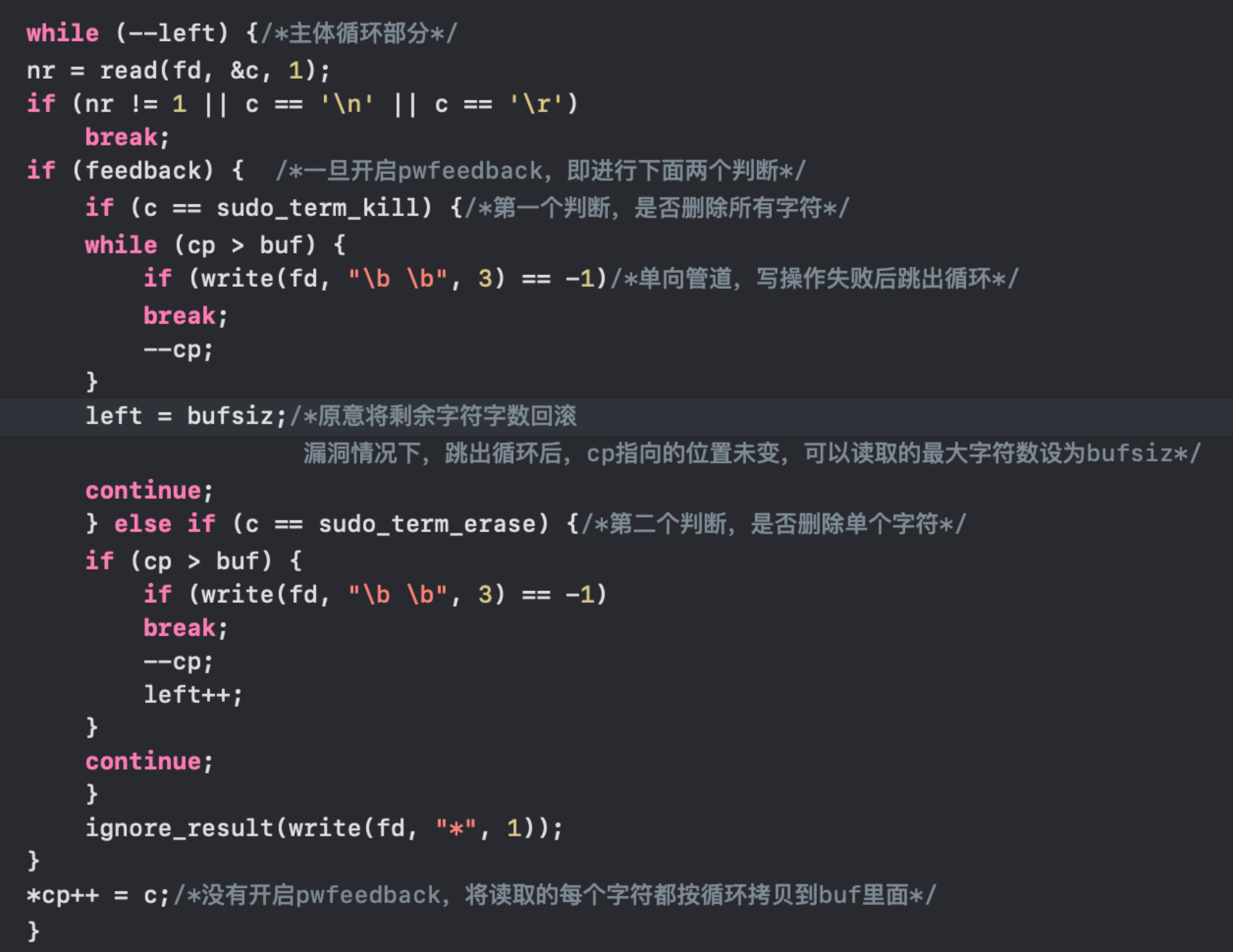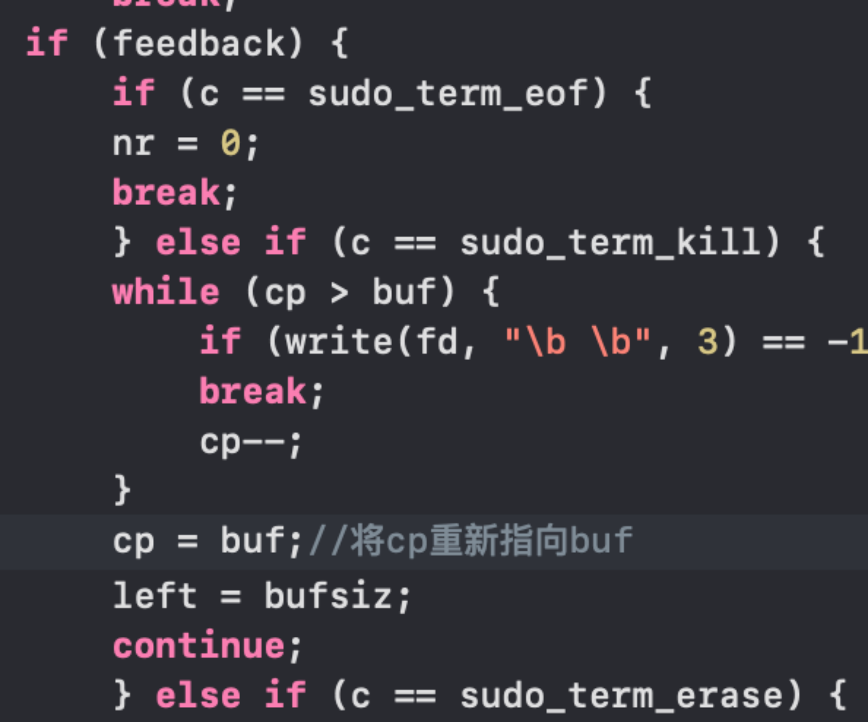 在c==sudo_term_eof的判断最后,将cp又重新指向buf起始点,这样又可以通过bufsiz控制循环了,本次c==sudo_term_kill判断,作用就只是被限定为重置本次密码读取。从根本上解决了cp指针在不受控的bufsiz下产生的问题。