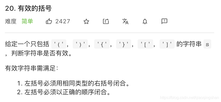 这道题比较简单,就是利用了栈先进后出的特性,然后对括号进行匹配。